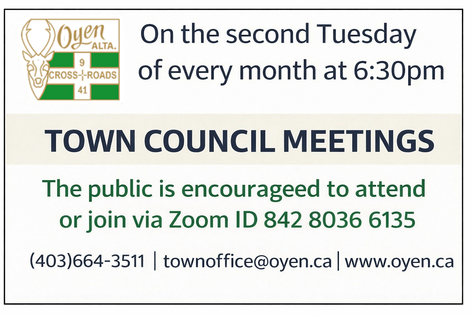 ![]() | Regular Council Meetings are held in the Town Office Council Chambers and are open to the public. Special Council Meetings will be posted here and to the Town of Oyen Facebook Page when necessary. Visit the Council Agenda & Minutes page to view past documents. |
